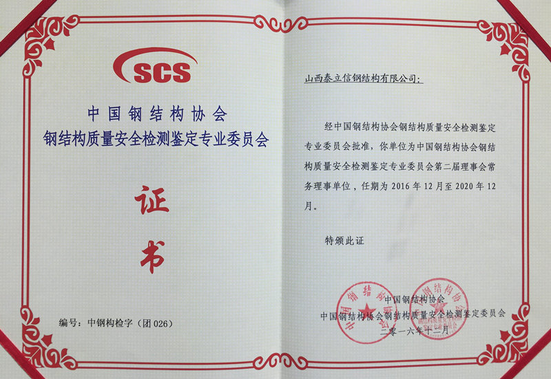 中國鋼結構協會鋼結構質量安全檢測鑒定委員會是由安監總局推薦,經民政部和中國鋼結構協會批準成立,專門從事鋼結構建(構)筑物及相關配套產品的質量安全檢測鑒定活動的社團組織。委員會于2012年正式成立,目前共有會員單位120余家,均由全國鋼結構施工企業、鋼結構制造企業、設計院、高等院校、科研院所和檢測鑒定機構組成。委員會的理事會和常務理事會成員是由各會員單位長期從事鋼結構研究、教學、生產、設計、施工、檢測、鑒定、檢測設備生產和銷售領域的專家、學者和企業家組成。